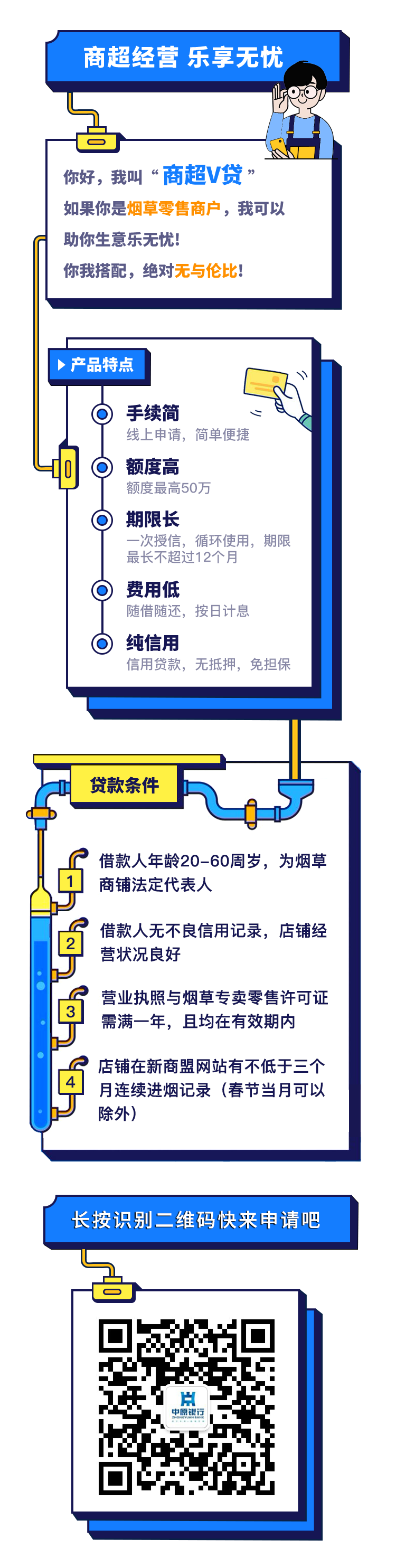 “商超V贷”是中原银行为支持烟酒零售商户复工复产,向依法诚信经营的持有烟草零售专卖许可证的个体工商户或小微企业主发放的信用类经营贷款。