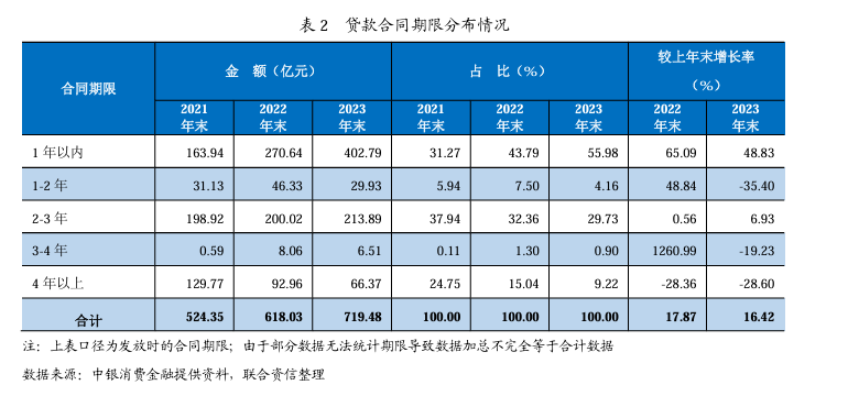 产品期限方面,2021-2023年,线上化进程推动短期贷款占比提升,额度趋向小额分散。具体到业务数据方面,中银消金1年以内的贷款占比提升,2年以上的占比有所下降,截至2023年底,1年以内占比已过半: