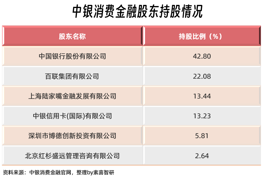 从股权结构来看,截至2023年末,中国银行直接持股42.80%,并通过中银信用卡间接持有13.23%;直接与间接方式合计持股达56.03%,从而成为中银消金控股股东和实际控制人。