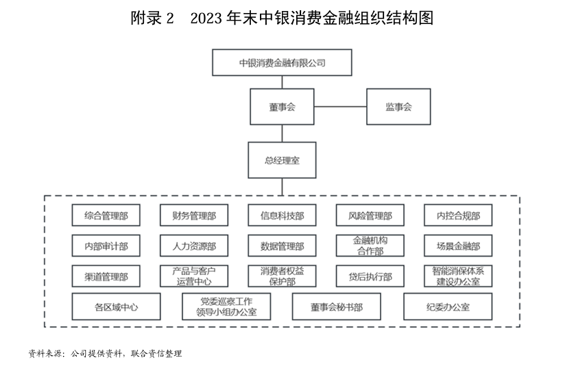 组织架构层面,中银消费金融总部位于上海,截至2023年末,已在全国27个省(市)设立了区域中心。中银消金设有渠道管理部、金融机构合作部等前台业务开展部门,风险管理部、综合管理部、财务管理部、信息科技部、内控合规部等多个中后台部门,如图所示: