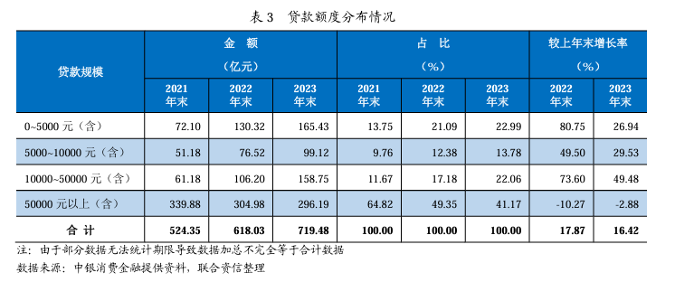 产品额度方面,中银消金线下单笔较高,集中在5万以上;线上主要为信用贷款,单笔金额通常在5万元以下。总体看,额度主要集中在5千以内和5万以上区间,5万以上占比较高,但线上转型的持续促使5万以上贷款的占比出现显著下降:
