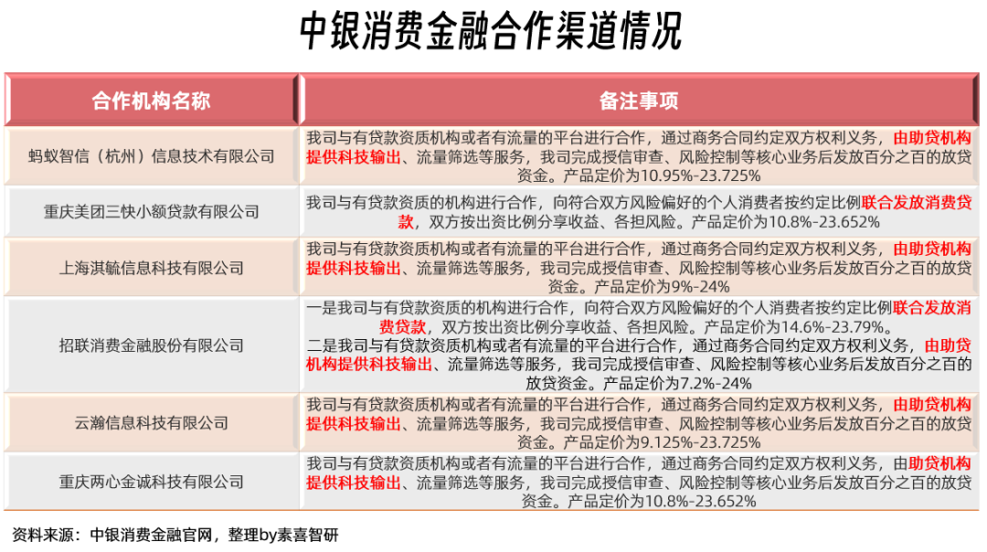 合作渠道层面,素喜智研观察到,中银消金披露了6家合作渠道并添加了备注说明,分别有蚂蚁智信(杭州)信息技术有限公司、重庆美团三快小额贷款有限公司、上海淇毓信息科技有限公司(奇富科技,原360数科)、招联消费金融股份有限公司、云瀚信息科技有限公司(京东数字科技旗下控股公司)、重庆两心金诚科技有限公司(美团系),具体如下所示: