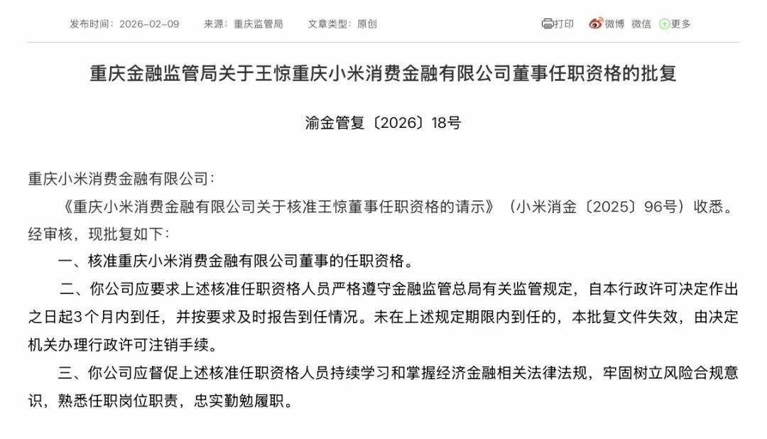 2月9日,消费金融获悉,国家金融监督管理总局重庆监管局近日发布批复,核准王惊担任重庆小米消费金融有限公司董事的任职资格。